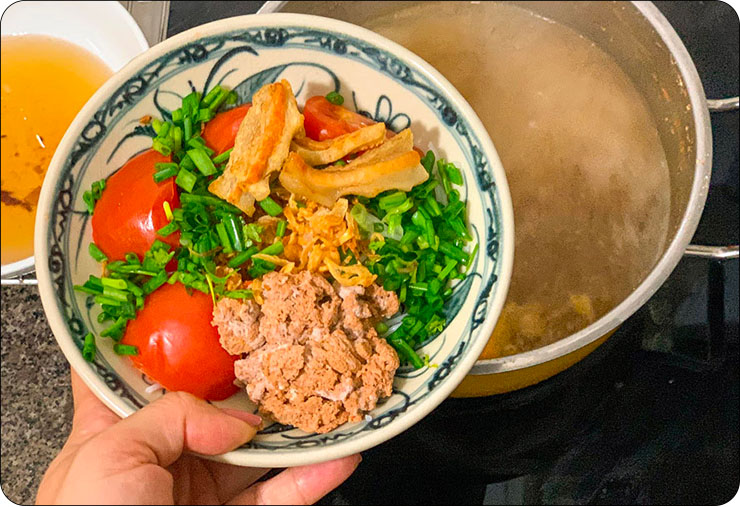1. Caldo: O caldo é o coração do Bún Riêu e é onde o sabor se desenvolve. Ele é preparado a partir de carcaças de caranguejo, carne de porco e uma variedade de temperos como pasta de camarão, alho e chalotas. Essa mistura é cozida em fogo baixo por horas para extrair todos os sabores e criar um caldo rico e delicioso.