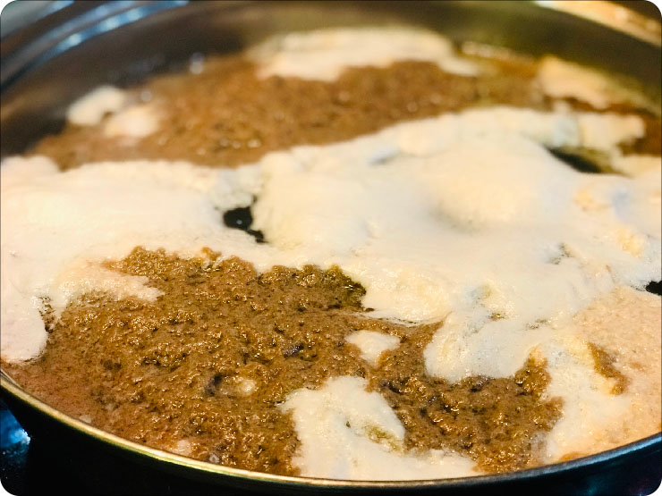 Reduza o fogo para médio-baixo ou baixo, de modo a manter uma fervura baixa enquanto prepara o Riêu.