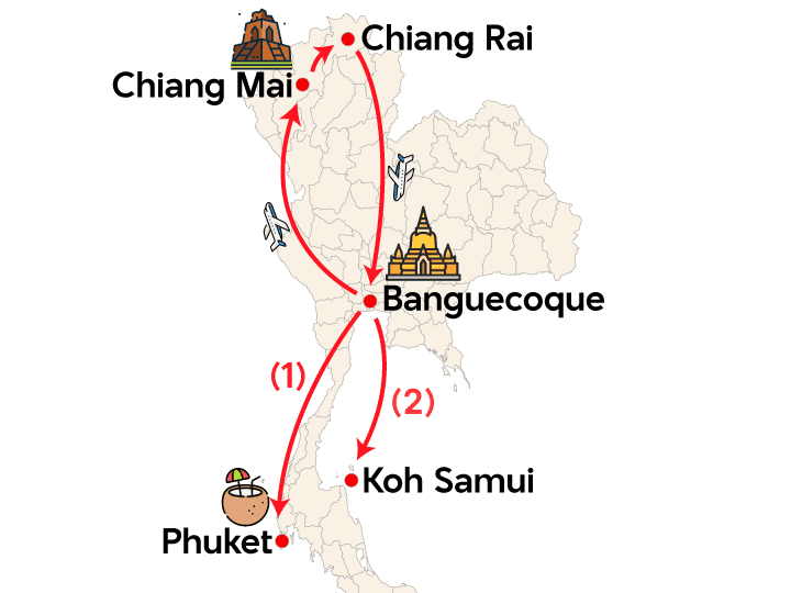 Etapas da viagem: Bangkok - Chiang Mai - Chiang Dao - Chiang Rai - Triângulo de Ouro - Mae Kham - Phuket - Koh Samui