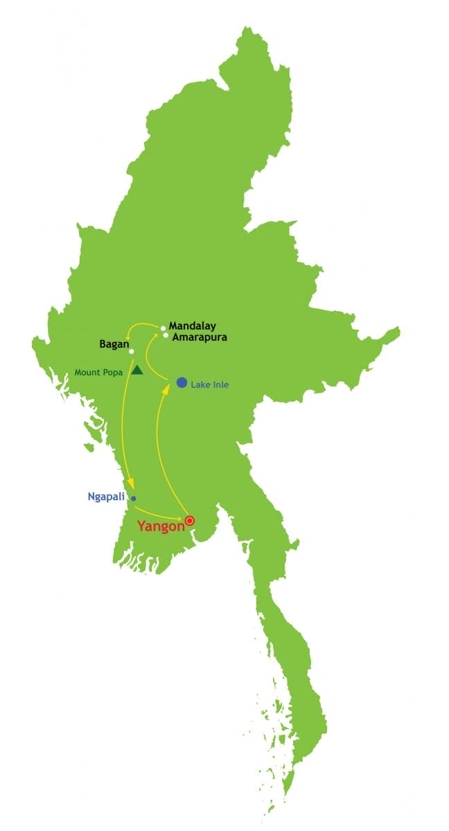 As etapas da sua viagem: Yangon - Mandalay - Amarapura - Monywa - Bagan - Pindaya - Inle - Rocha Dourada - Bago - Partida
