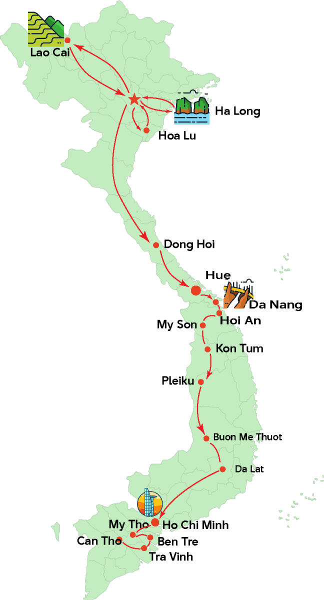 Etapas da viagem: Hanói - Hoa Lu - Hanói - Ha Long - Bai Tu Long - Hanói - Lao Cai - Sapa - Bac Ha - Ban Khoang - Ta Giang Phinh - Hanói - Dong Hoi - Hue - Da Nang - Hoi An - My Son - Kon Tum - Pleiku - Buon Ma Thuot - Da Lat - Ho Chi Minh - My Tho - Ben Tre - Tra Vinh - Can Tho - Partida